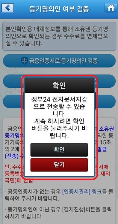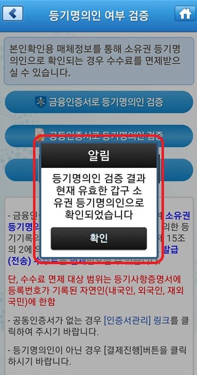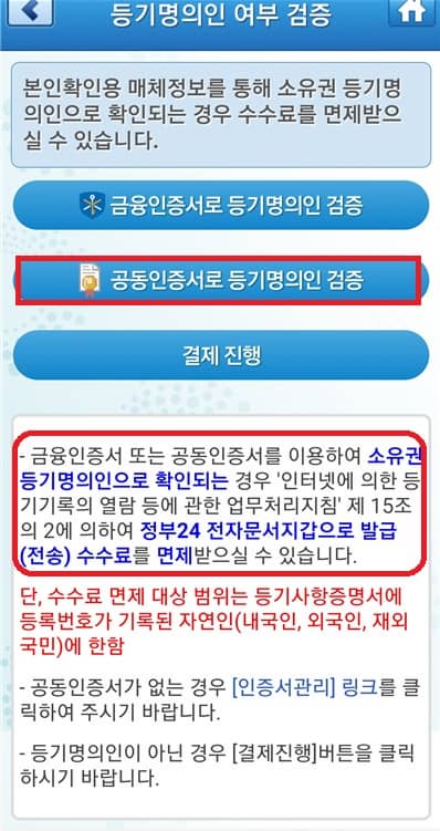등기명의인인 경우 인증을 통해 검증 해서 수수료를 면제 받으시고