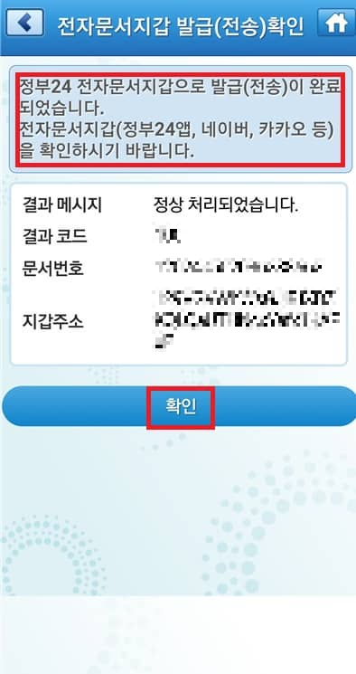 전송이 완료된 것을 확인 한 후 전자문서지갑(정부24앱, 네이버나 카카오 등)으로 이동합니다.