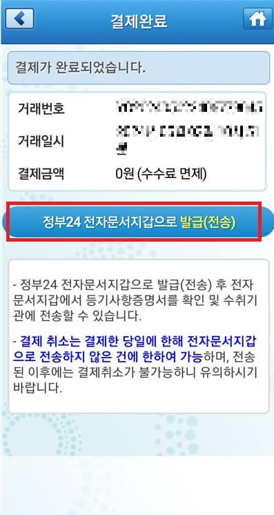 "정부 24 전자문서지갑으로 발급(전송)"을 터치합니다.