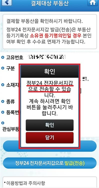 화면 속 "부동산 열람 전자발급(전송)"을 터치해주세요