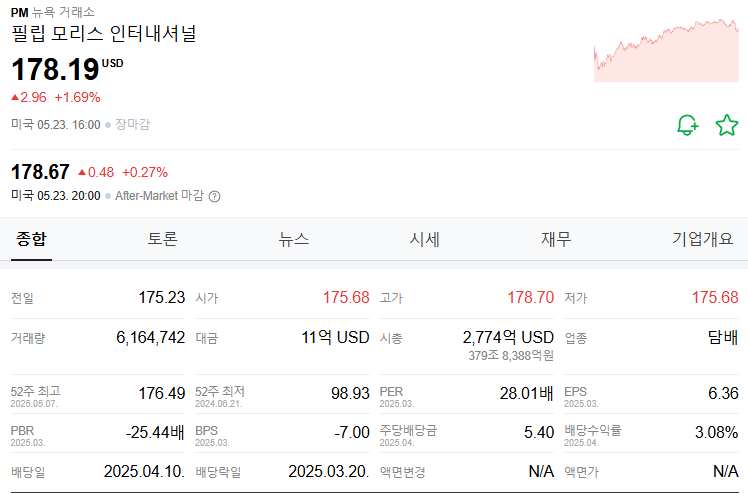 2025년 5월 말 기준, 필립모리스 주가는 약 178.19달러 선에서 안정적인 흐름을 보이고 있으며, 고배당주로도 유명합니다.